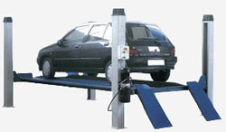 Электрогидравлический четырехстоечный подъемник. Ручная система блокировки платформы.