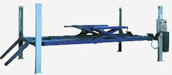 Электрогидравлический четырехстоечный подъемник для регулировки развала– схождения с передними выемками под поворотные круги, с задними подвижными платформами и встроенной траверсой для вывешивания колес.