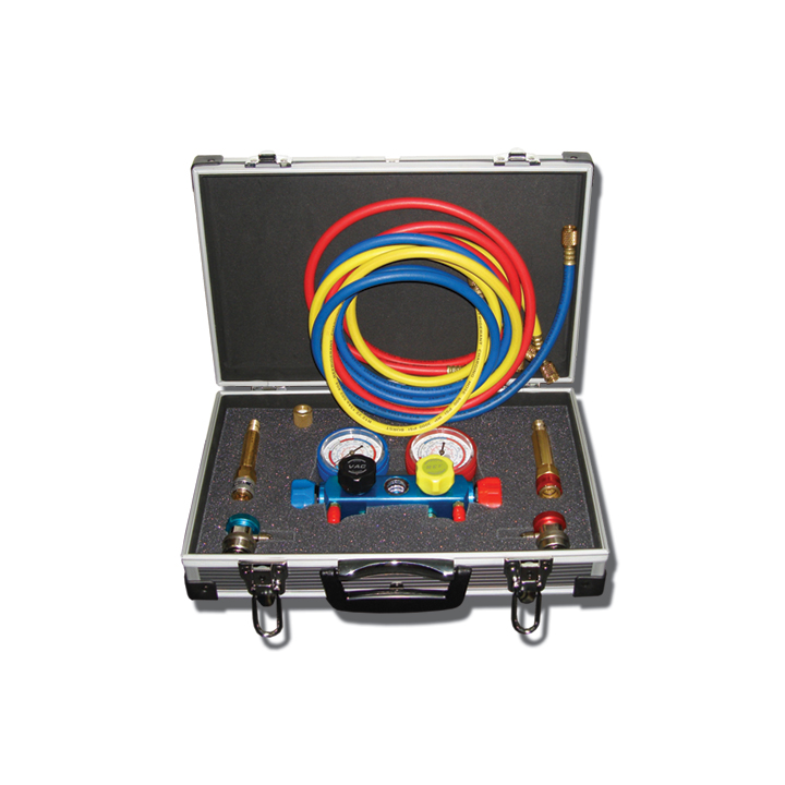 Предназначен для заправки и диагностики (измерения давления в контурах системы кондиционирования). Через данный прибор можно подключить остальное сервисное оборудование, проводить диагностику и контролировать ход работ по обслуживанию системы. Может комплектоваться шлангами различной длины.