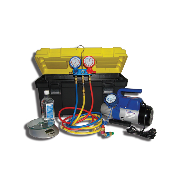 Портативное устройство включает в себя переносной кейс в котором размещены:одноступенчатая вакуумная помпа с дополнительным вакуумметром, двухвентильный манометрический коллектор, заправочные шланги с комплектомпрямых быстросъемных переходников и электронные весы(точность 1-5 гр, до 5 кг).