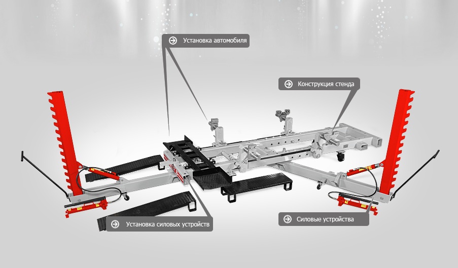 Основа стенда — жесткая рама с синхронно поворачиваемыми рычагами с зажимами для закрепления кузова в четырех точках.