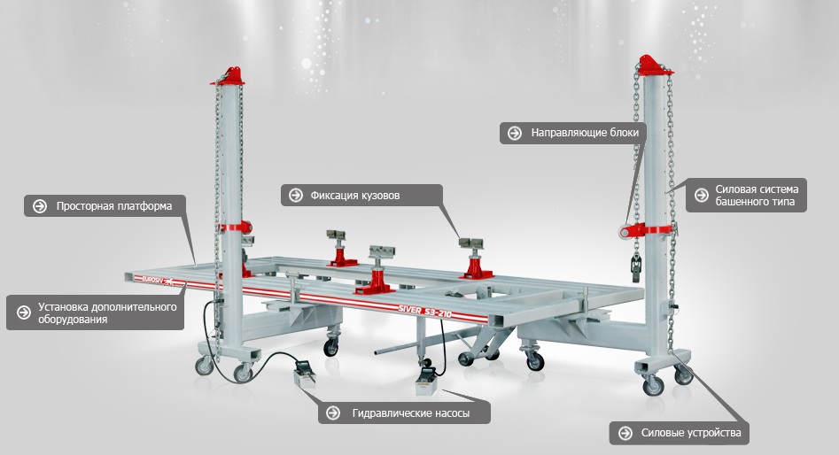 Стенд для правки кузовов SIVER С предназначен для восстановления аварийных кузовов транспортных средств. Оборудование имеет сертификат соответствия требованиям безопасности (C-RU.MT20.B.10011) и пожизненную гарантию на платформу.